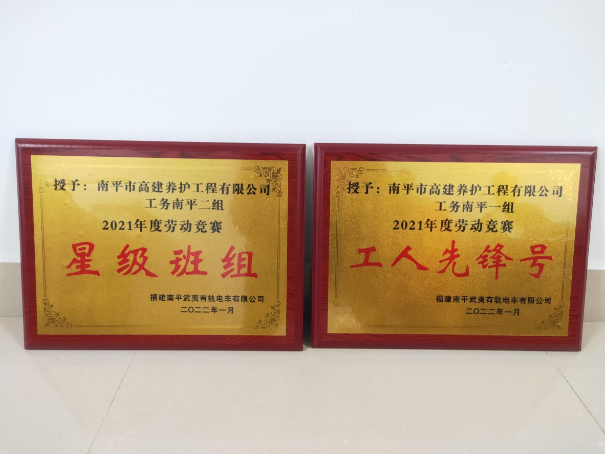 武夷有轨电车公司于2022年1月开展了2021 年度劳动竞赛活动,本次竞赛共分为6个专业,南平市高建养护工程有限公司下属的南平工区和武夷山工区参加了工务专业的竞赛,通过一轮又一轮激烈的比拼,南平工区李世兴、潘仰宏、翁建涵、黄海代表参赛,获得“星级班组”奖;宋瑞文、林剑辉、刘建华、许平代表参赛,获得“工人先锋号”奖;黄海,获得金牌工人奖;刘建华,获得星级个人奖。