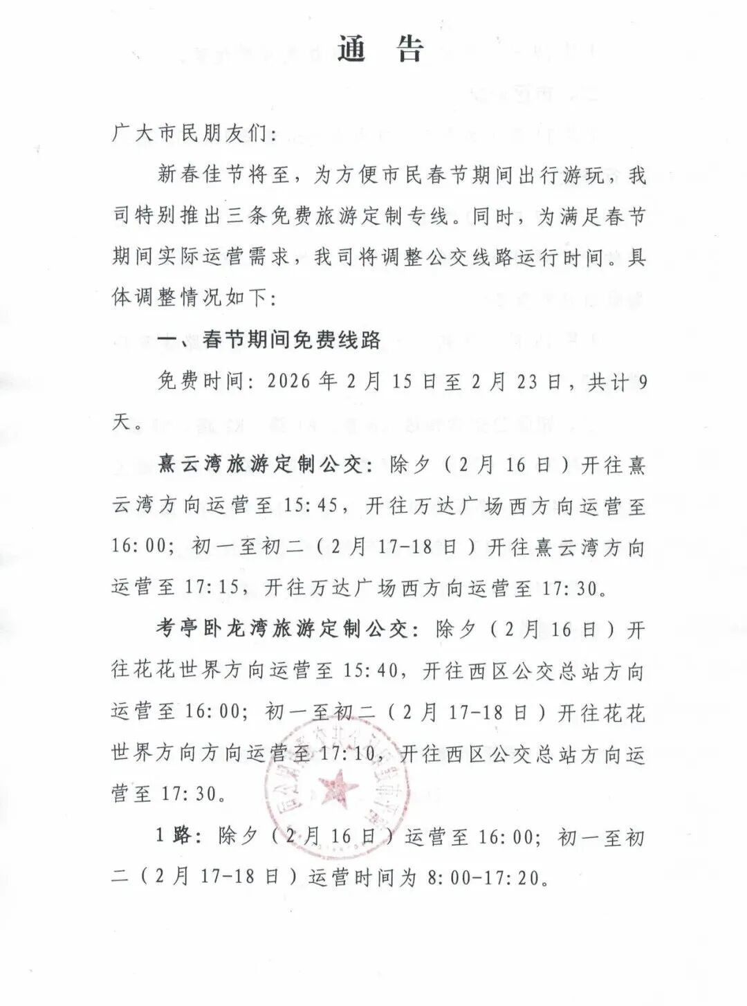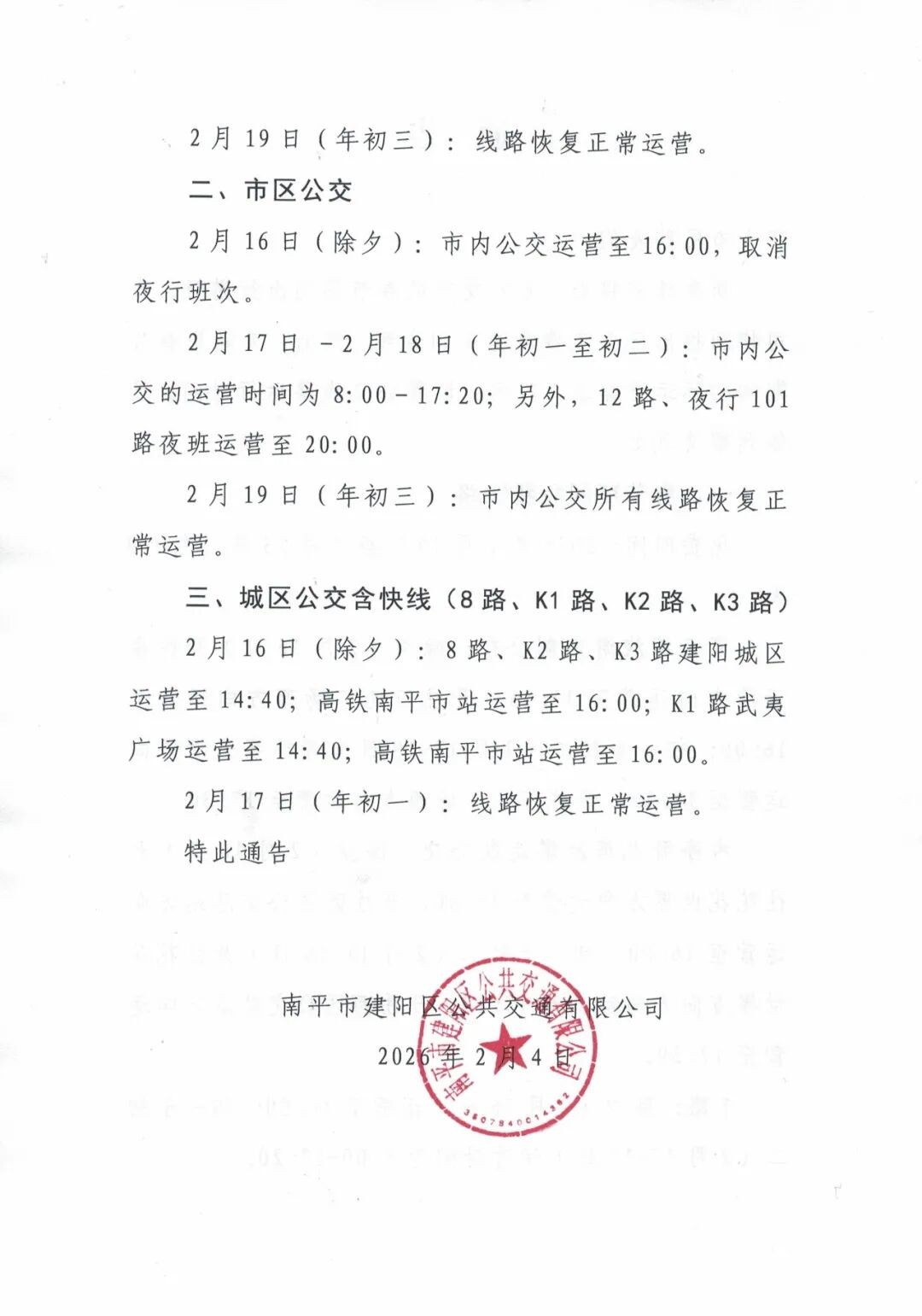 关于春节期间建阳公交运行时间调整的通告