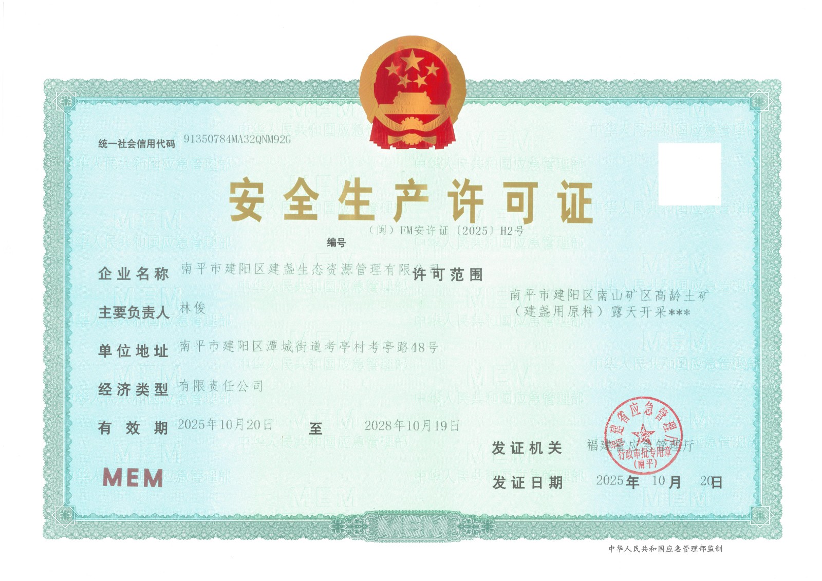 南平市建阳区建盏生态资源管理有限公司根据《非煤矿矿山企业安全生产许可证实施办法》要求,完成全流程合规准备,并通过召开安全设施自主验收评审会、市级安全生产许可证核发现场核查及第三方安全评价通过专家评审,于2025年10月20日取得非煤矿矿山《安全生产许可证》,为建盏产业核心原料的稳定供应扫清关键障碍。高岭土矿的规范化生产将解决原料品质不均等问题,亦将给建盏产业供应首批可追溯的高品质原材料。