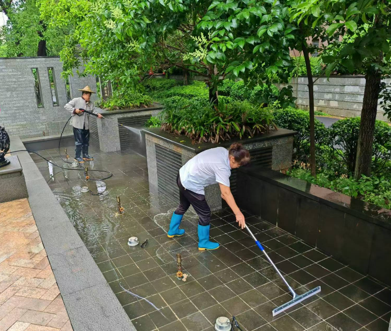保洁与绿化团队用双手扮靓家园。保洁组分工明确,主干道早晚清扫、设施每日两次消毒擦拭、垃圾日产日清。绿化组依季养护,春剪枝补绿、夏浇水防虫、秋清叶护草、冬裹树除草,让小区四季整洁有景。